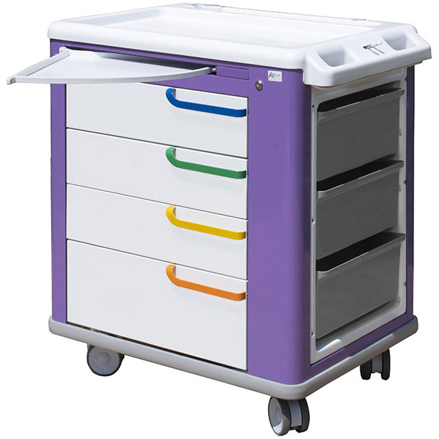 COSTRUZIONE: solida, robusta con l’utilizzo di lamiera di acciaio 10/10 verniciata con polveri epossidiche antimicrobiche e componenti in materiale plastico (tecnopolimeri) per ottenere la massima leggerezza, manovrabilità e praticità d’uso. DESIGN: accurato nei minimi particolari, si armonizza con qualsiasi ambiente. STRUTTURA: autoportante e monoscocca. PARTE SUPERIORE: ampio piano di appoggio in PST groffato colore bianco RAL 9003 senza spigoli vivi per facilitarne pulizia e disinfezione con maniglia di spinta integrata. Altezza da terra mm 1000. MANIGLIONE DI SPINTA: ergonomico, integrato sul piano di lavoro, con meccanismo per blocco e sblocco centralizzato dei freni delle ruote. PARTE FRONTALE: predisposta per l’inserimento di cassetti modulari, senza spigoli taglienti con l’interno arrotondato. Dotato di piano d’appoggio supplementare a scomparsa con apertura a spinta “push & pull”. Scorrimento silenzioso dei cassetti su guide ad estrazione totale ed ammortizzate “soft self closing” con cuscinetti a sfere, muniti di fermo corsa e predisposti per chiusura centralizzata a chiave CASSETTI DI SERIE: realizzati completamente in acciaio verniciato con frontalino in acciaio verniciato; nr. 3 cassetti dimensioni 450x485x150H; nr. 1 cassetto dimensioni 450x485x225H. CHIUSURA: centralizzata a chiave. PARTE LATERALE SX: piano di lavoro supplementare estraibile in materiale plastico tecnopolimero. PARTE LATERALE DX: vano ad incasso in materiale plastico tecnopolimero. RUOTE: n. 4 diam. mm. 100, gemellate, con sistema di bloccaggio automatico, supporto in poliammide, girevoli su cuscinetti a sfera di precisione, perno filettato con collare esagonale, fascia in poliuretano termoplastico. PARAURTI: perimetrale integrato alla base del carrello. IGIENE: la particolare costruzione permette una facile pulizia e disinfezione. USO: Si adegua ad ogni tipo di organizzazione esistente. SICUREZZA: in conformità con le norme vigenti.