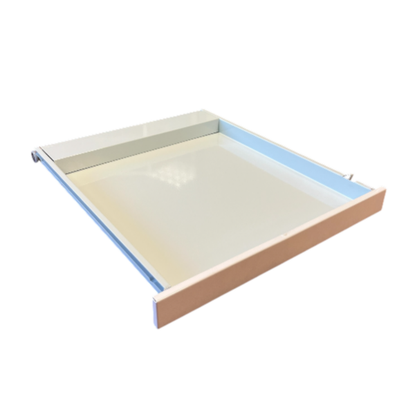 Cassetto completamente in acciaio verniciato con polveri epossidiche antibatteriche, con frontale in acciaio verniciato. Scorrevole su silenziose guide in acciaio verniciato con cuscinetti a sfere, muniti di fermo corsa. Dimensioni mm: 450x475x45H