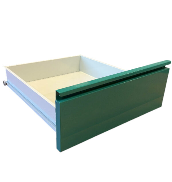 Cassetto completamente in acciaio verniciato con polveri epossidiche antibatteriche, con frontale in acciaio verniciato, maniglia incassata antitrauma. Scorrevole su silenziose guide in acciaio verniciato con cuscinetti a sfere, muniti di fermo corsa e predisposti per chiusura centralizzata a chiave. Dimensioni mm:450x475x225H