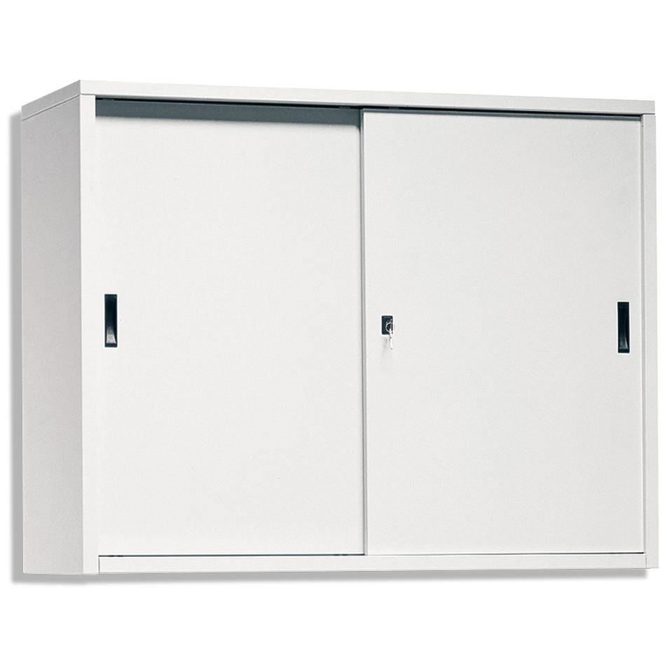 Sopralzo costruito in lamiera di acciaio verniciata a polveri epossidiche con ante scorrevoli su cuscinetti a sfera, maniglie ad incastro e serratura.