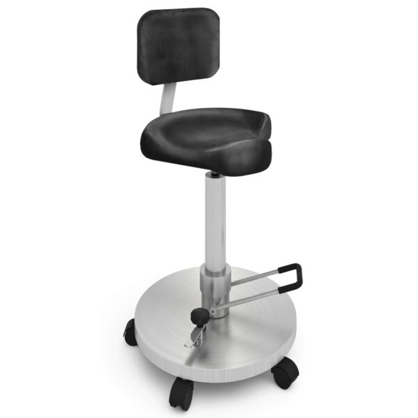 Sedile a sella anatomica e schienale imbottiti in poliuretano ignifugo ad alta densità per garantire una postura confortevole; il sedile e lo schienale sono rivestiti in similpelle antistatica. Rotazione della sella di 360°. Schienale anatomico con sostegno dorsale, studiato per non interferire col braccio pulito del chirurgo, regolabile in altezza e profondità.