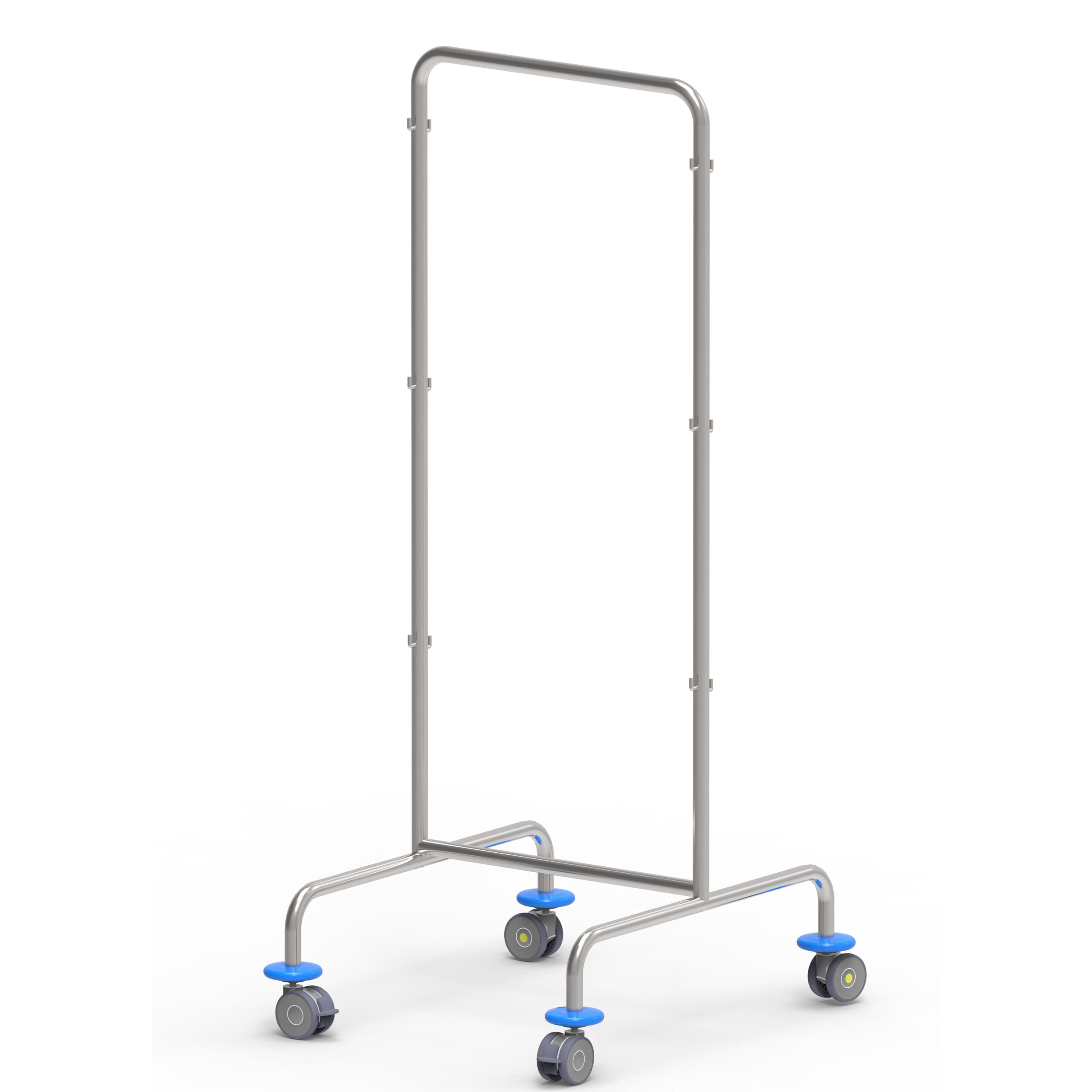 Alla base 4 ruote diam. 75 mm antitraccia, di cui 2 dotate di freno e 2 antistatiche, 4 paracolpi perimetrali.