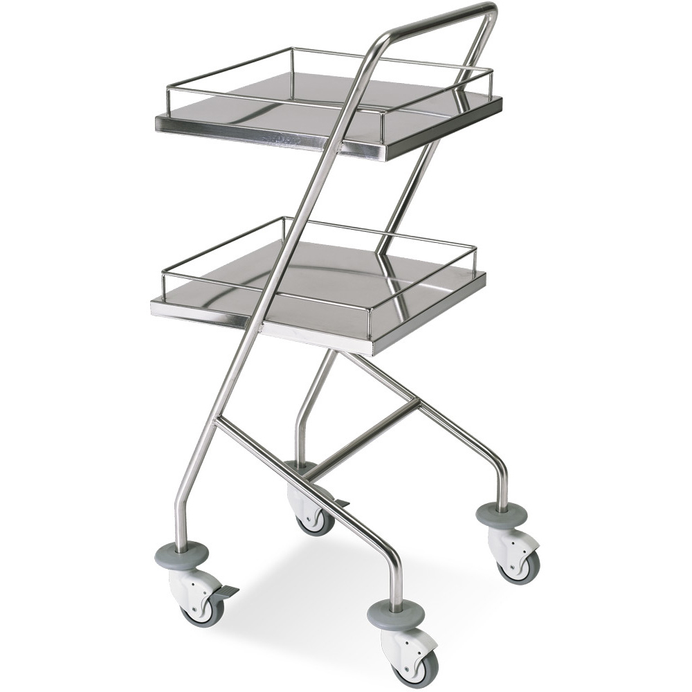 Carrello interamente in inox AISI 304. Nr. 2 ripiani lisci, dimensioni 36×36 cm, in acciaio inox con bordini di contenimento (H 4,5 cm) sui quattro lati.