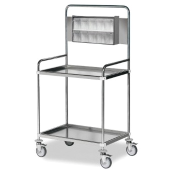 Struttura in acciaio inox AISI 304. Nr. 2 ripiani in acciaio inox AISI 304 estraibili con bordini di contenimento. Nr. 2 maniglioni di spinta integrati nella struttura. Nr. 4 ruote girevoli diametro mm. 125. Completo di sopralzo: struttura pensile in tubo d’acciaio con nr. 2 blocchi cassetti in plastica da 5 pezzi ad apertura basculante ed estraibili.