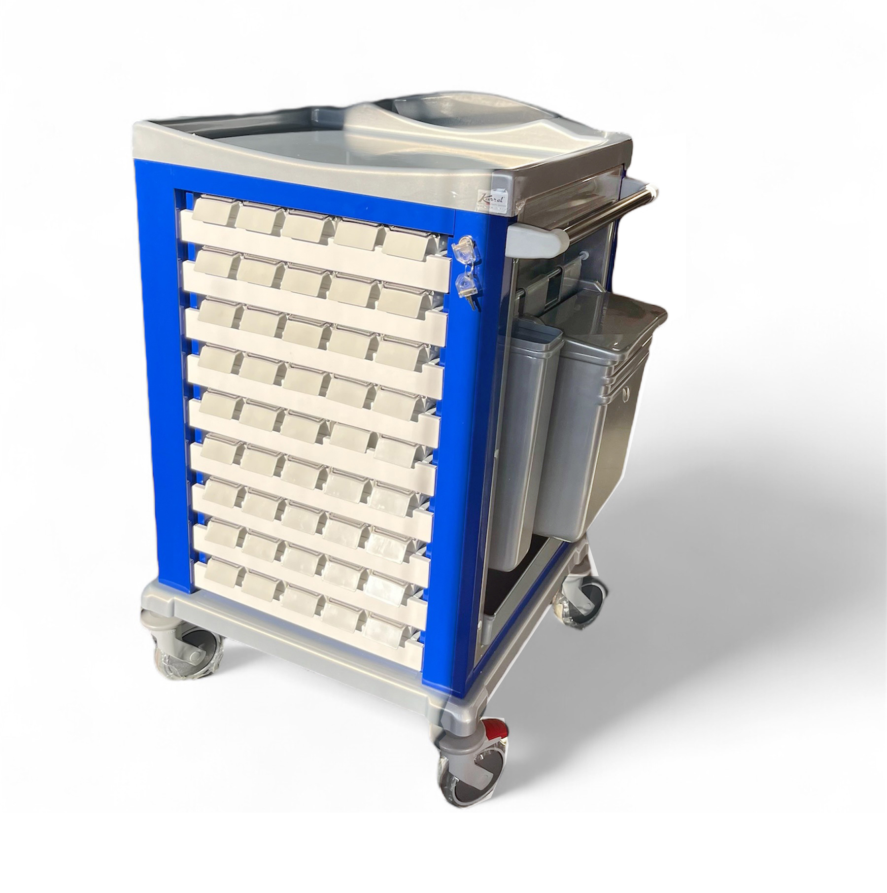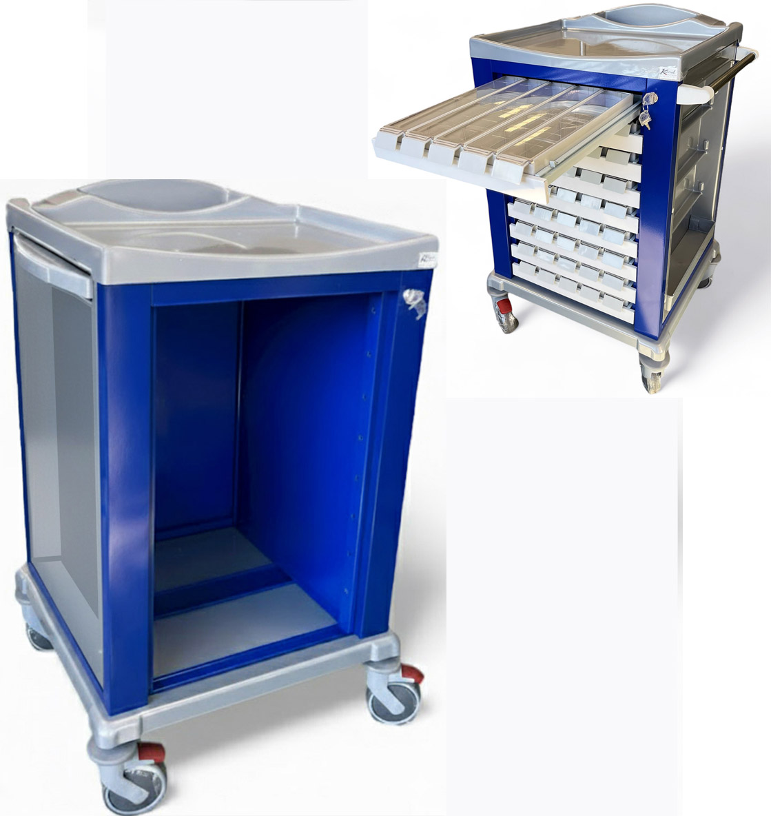 Struttura realizzata in acciaio verniciato a polveri epossidiche con additivo antimicrobico. La geometria è caratterizzata da linee arrotondate, prive di spigoli che consentono un’efficace sanificazione ed evitano punti di accumulo dello sporco. Parte frontale dotata di chiusura centralizzata con chiave. Spazio frontale predisposto per l’inserimento di cassetti. Le guide ad estrazione totale con cuscinetti a sfere, muniti di fermo per evitare l’estrazione accidentale, permettono uno scorrimento morbido dei cassetti e forniscono un accesso completo al contenuto. Piano superiore in materiale plastico lavabile e disinfettabile dotato di un’ampia superficie di lavoro con vano porta oggetti e bordo perimetrale di contenimento. Nel top sono presenti le predisposizioni per il fissaggio degli accessori. Nel lato destro è presente una maniglia di spinta sagomata con impugnatura ergonomica per un controllo sicuro del carrello. Nel lato sinistro è inserito un piano di lavoro supplementare estraibile. Entrambi i fianchi sono predisposti per l’inserimento di vani ad incasso porta accessori. Nr. 4 ruote girevoli singole diametro 125 mm, di cui 2 con freno a pedale (poste su lato anteriore) a bloccaggio totale. Ogni ruota monta un paracolpo girevole in materiale plastico morbido. Supporto e ruote in materiale plastico di alta qualità, girevole su doppio giro di sfere, Perno liscio, sezione tonda. Nucleo ruota in poliammide, fascia in poliuretano termoplastico, con parafili, cuscinetto a sfere di precisione. Dim. 770X640X1000 mm
