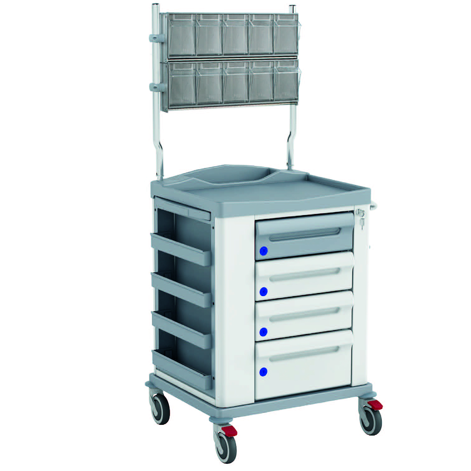 Nel piano top, ai due angoli posteriori, sono inserite due aste porta accessori alle quali sono fissate due cassettiere con ciascuna 5 cassetti a ribalta.
