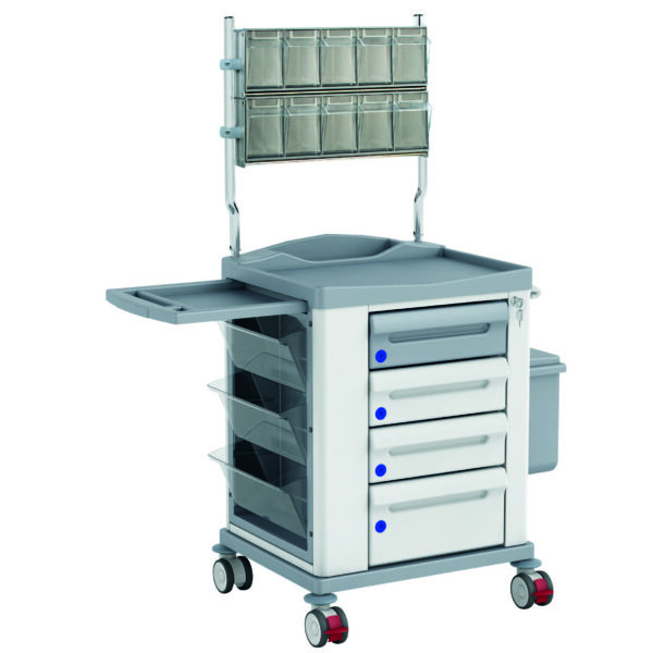 Nel lato sinistro è inserito un piano di lavoro supplementare estraibile e un vano ad incasso con 3 tasche a ribalta. Paracolpi perimetrale integrato alla base del carrello. Nr. 4 ruote piroettanti diametro 125 mm di cui 2 con freno a pedale (poste su lato anteriore).