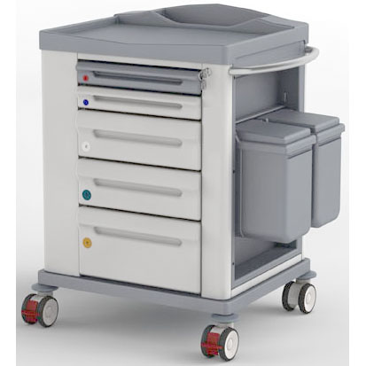 Configurazione: nr. 2 cassetti mm 450x75h; nr. 2 cassetti mm 450x151h; nr. 1 cassetto 450x228h. Piano superiore in materiale plastico lavabile e disinfettabile dotato di un’ampia superficie di lavoro con vano porta oggetti e bordo perimetrale di contenimento.