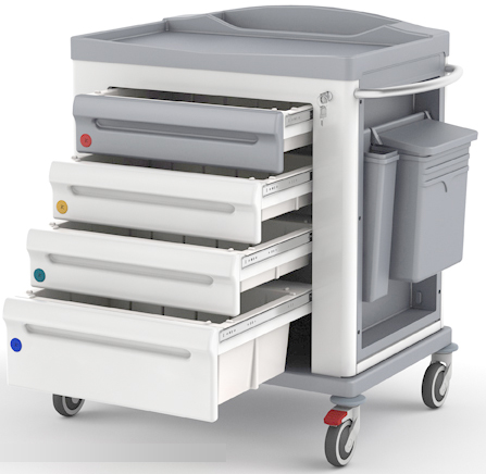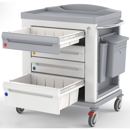 Nel lato destro è presente una maniglia di spinta sagomata con impugnatura ergonomica per un controllo sicuro del carrello e un vano ad incasso con porta rifiuti da 15 litri ad apertura manuale e porta cateteri.